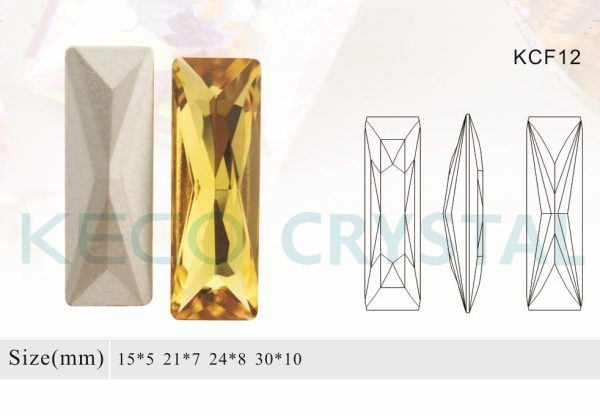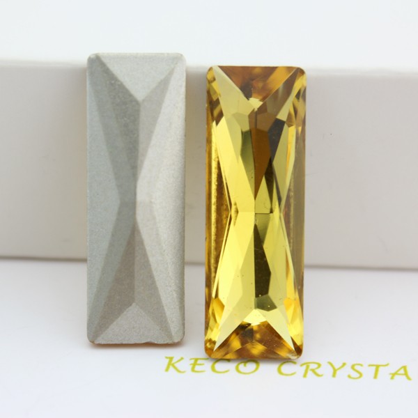 keco crystal is a manufacturer of lead free pointed back baguette crystal stone for shoes or jewerly decoration, 15-30mm size, clear or coating color
