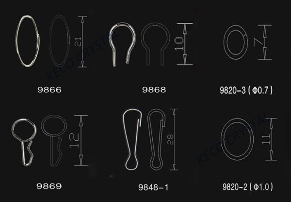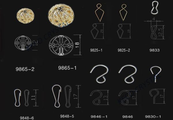 The hook, hanger, pins, clips, prongs and wire are used to attach the crystal chandelier parts and frame the crystal chandelier. The type including hanger, prongs, hook, pins, clips, hangers, open eye pins, headed pins, bow tie hanger, oval ring, round ring, with gold plated, brass, chrome metal material to keep good quality,