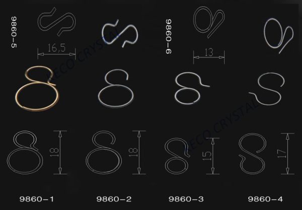 The hook, hanger, pins, clips, prongs and wire are used to attach the crystal chandelier parts and frame the crystal chandelier. The type including hanger, prongs, hook, pins, clips, hangers, open eye pins, headed pins, bow tie hanger, oval ring, round ring, with gold plated, brass, chrome metal material to keep good quality,